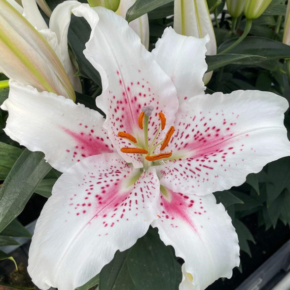 Восточная лилия. Размер луковицы 18/20. Количество цветков от 6. Компактный размер этого сорта делает его идеальным для выращивания в горшках. Высота взрослого растения 45 см. Цветки обычно белые с мелкими розовыми точками или линейными штрихами в центральной части. Душистая лилия – аромат сильный , особенно вечером.
