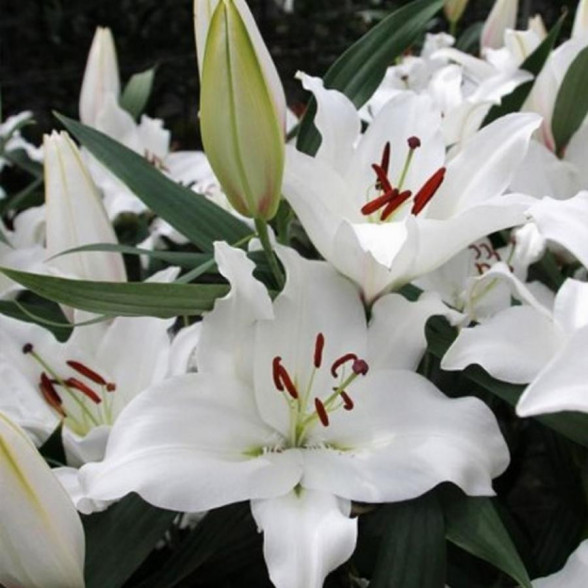 Восточная лилия. Размер луковицы 20/22. Количество цветков 8+. Высота взрослого растения 110 см. Цветок белый со слегка волнистыми краями лепестков. Сорт ароматный.